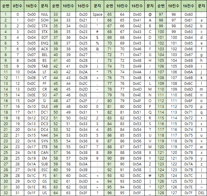 아스키코드 첨부파일도 있으니 필요하면 다운로드!